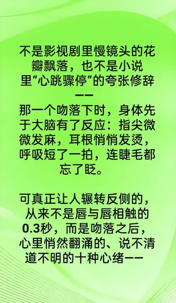 综合来看,女人被男的吻过后的心理,不仅是瞬间的心动,更是一系列生理、情感和认知的复杂反应,它们共同影响着女性对这段关系的感受和未来的期待。