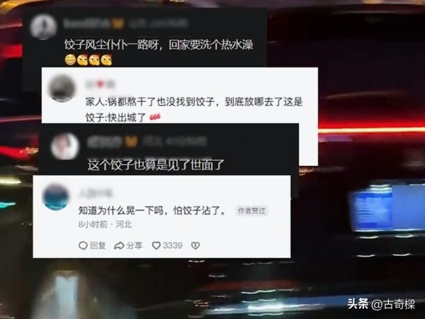 这一幕被后方的一位车主看到了,他当时在路口等红灯,发现前车车顶上竟然有一盘"水灵灵"的饺子,觉得既可爱又好笑,还以为是车主忘了拿下来。