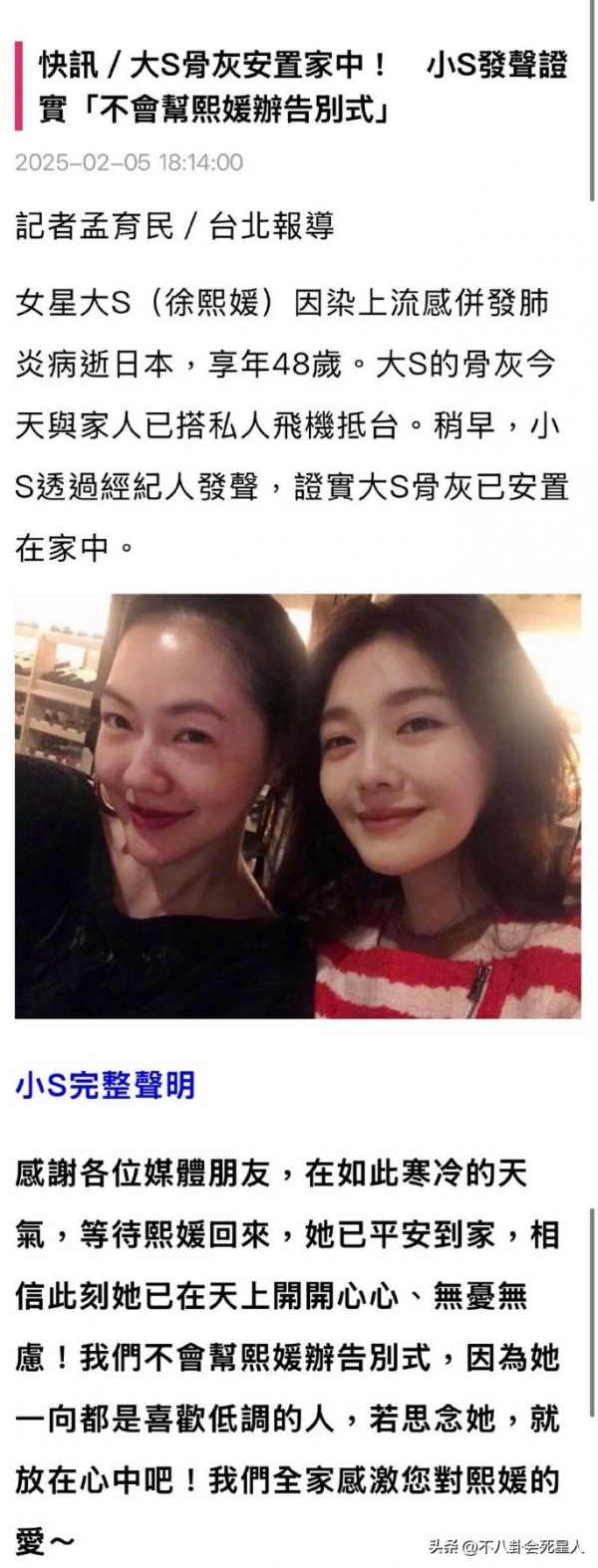 可在声明的末尾,小S称家人将不再为熙媛办告别仪式,理由是她本人一向喜好低调,徐熙媛的骨灰已经安置在了家中。