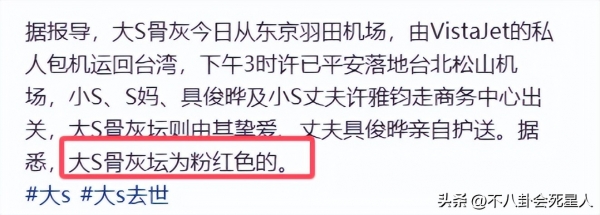 另有知情人爆料,大S的骨灰坛是粉红色的,如果属实,那S的家人还是遵从了大S的少女心,在这件事情上,保留了徐熙媛的个人意愿。
