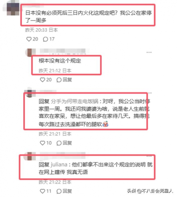 不少网友纷纷发表自己的疑惑,甚至不少日本IP的网友都站出来质疑所谓的在日本必须要3日内火化的事情,这项规定根本就不存在。