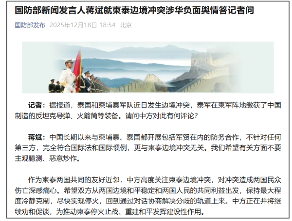 微信公众号"国防部发布"12月18日消息,国防部新闻发言人蒋斌就柬泰边境冲突涉华负面舆情答记者问。