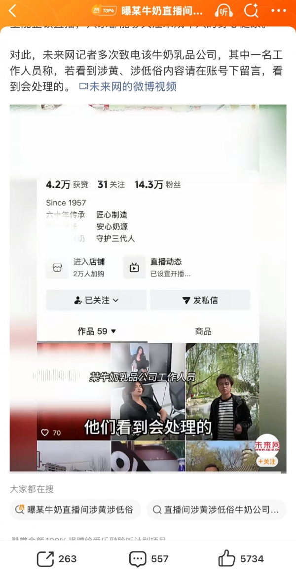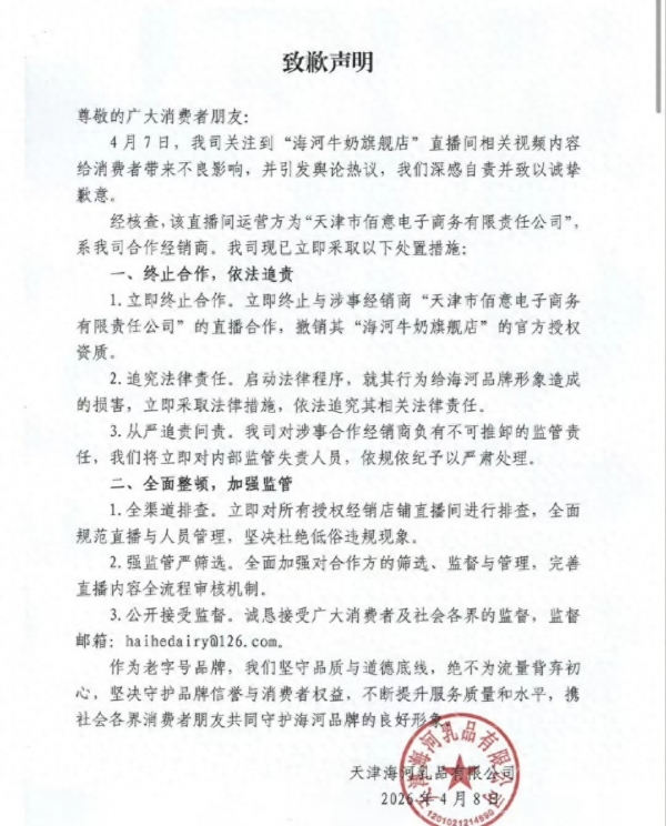 经海河乳品核查,涉事直播间运营方为"天津市佰意电子商务有限责任公司",系公司合作经销商。海河乳品随即采取一系列处置措施:终止与其直播合作,撤销其"海河牛奶旗舰店"的官方授权资质;启动法律程序,就品牌形象受损一事依法追责;并对内部监管失责人员予以严肃处理。涉事主播事后公开回应,坦言"错就是错",恳求舆论不要波及身边亲友。