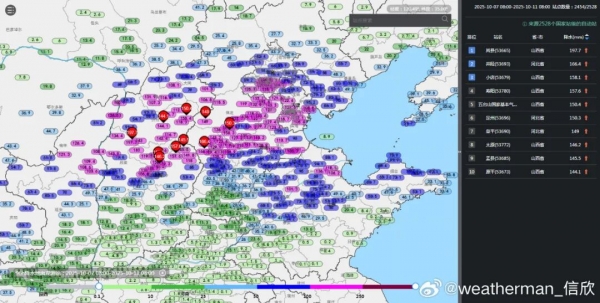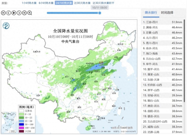 昨天到今晨,华北雨势依旧不减,四川东北部也加入强降雨"战队"。四川江油单日暴雨51.9毫米,拿下全国榜首。7日至11日早晨,陕西北部、山西中北部、河北中部、北京南部、天津南部累计雨量已超100毫米,相当于当地常年整个10月雨量的两三倍,同期少见。河北正定更夸张,连续73小时雨滴未停。