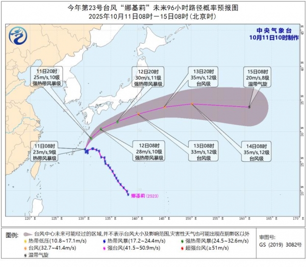中央气象台预计,台风"娜基莉"将以每小时15-20公里的速度向北偏东方向移动,向日本以南洋面靠近, 强度缓慢加强。受其影响,11日白天至夜间,东海东部偏东的部分海域有6-8级大风,阵风9-11级。