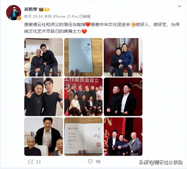 1月21日凌晨一点钟,德云社张鹤擎微博发布喜讯,张鹤擎被正式聘请为"中华文化促进会传统演艺工作委员会委员",这事绝对是郭老师一手操办的,因为上个月郭德纲刚刚被任命为中华文化促进会的副主席,当时还发表了讲话,中华文化促进会,是由国家民政部组建的全国性联合性社会组织,也是标准的"主流",与曲协的不同之处就是,在这里任命是没有工资可以拿的,如果有奖金也只会是郭德纲出钱。