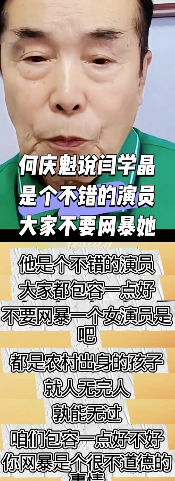 现在回头看,事情从闫学晶爆火"儿子挣几十万还不够花"之后就开始变得乱糟糟,她遭到网友集体炮轰,谁都不敢替她发声。没料到何庆魁却偏偏站出来撑闫学晶,又称女演员不易,"人无完人",但一句话没帮到忙,反而让自己成了众矢之的。网友们翻旧账,说他前后矛盾,以前还讽刺过闫学晶,怎么突然又变温情支持?何庆魁被骂懵了,急忙直播解释,说自己不了解真相,还为此向大家道歉,这姿态也是没谁了。