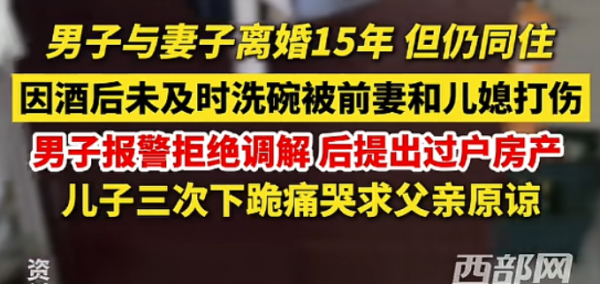 "电视剧都不敢这么演!"黑龙江,一男子与前妻一起住在儿子家,因喝酒后没洗碗,被儿媳数落,随后又与前妻吵架,没想到被前妻和儿媳揍了一顿,事后男子报警拒绝调解,提出过户房产才不追究责任,逼得儿子3次给他下跪痛哭!网友:还不如自己过!
