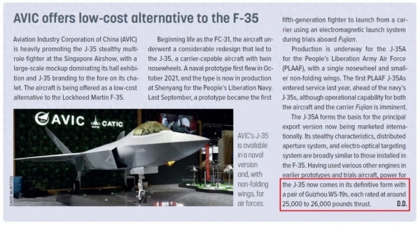 正在举行的新加坡航展上,中航工业展台可以说相当抢眼,歼-35A模型被摆在C位,尺寸不小,存在感极强。而真正引发军迷热议的,并不是歼-35A本身,而是航展会刊里一句看似不起眼、却信息量爆炸的描述--歼-35A的目标动力配置为两台涡扇-19,最大推力达到25000至26000磅。这个数据一出来,很多人的第一反应只有四个字:强得离谱!