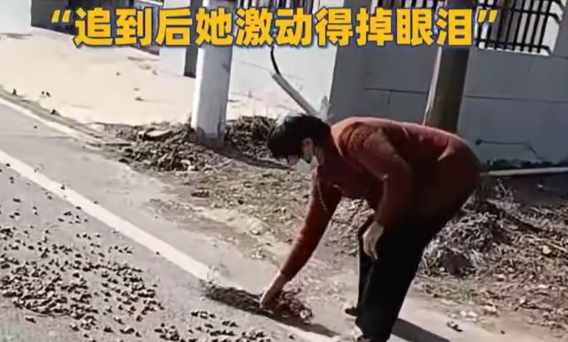 感动!河南周口,女子在院里干活时,突然看到有四袋花生从车上掉落,因为怕被别人捡走,她让姐姐守在现场,自己骑着三轮车连追五六里路找到失主,等女子说出此事后,对方眼泪哗的就流了下来。