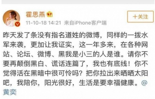 也就是在这个时候,黄毅清出来给黄奕撑腰了。他连发两条微博,每一条都十分恶臭。