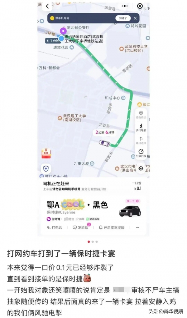 1月5日,一位浙江网友在社交平台上分享了她在湖北武汉的"神奇"打车经历,她通过某打车平台,竟以0.1元的价格打到了一辆保时捷卡宴。