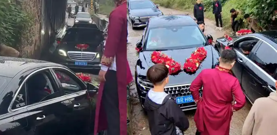 拍摄者告诉记者,最后大家把路边的树枝砍断,扒着路边的树枝车队才擦身而过,最后完美解决,没有耽误中午的拜堂。
