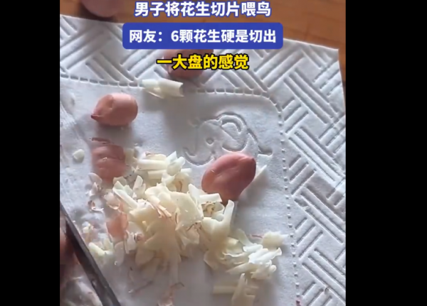 11月22日,男子将花生切片喂鸟,6颗花生硬是切出一大盘的感觉,网友:别切了 再切吃不下了。