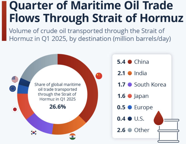 2025年第一季度经霍尔木兹海峡运输的原油量(按目的地划分,百万桶/日)。数据研究机构Statista