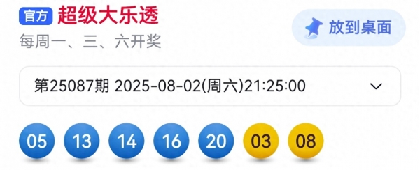 8月2日,超级大乐透第25087期开奖,前区号码是"05、13、14、16、20",后区是"03、08"。
