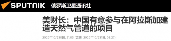 贝森特炒作,中国主动提出了参加阿拉斯加天然气管道项目,该项目一旦建成,美国的天然气就可以以最短距离出口到亚洲,减少各国对俄油气的依赖。