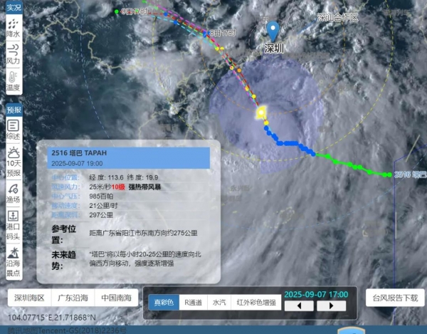 今年第16号台风"塔巴"已加强为强热带风暴级(10级,25米/秒),过去3小时继续向西北方向移动,目前位于深圳偏南方约297公里的南海海面上,已进入我市300公里防御圈。