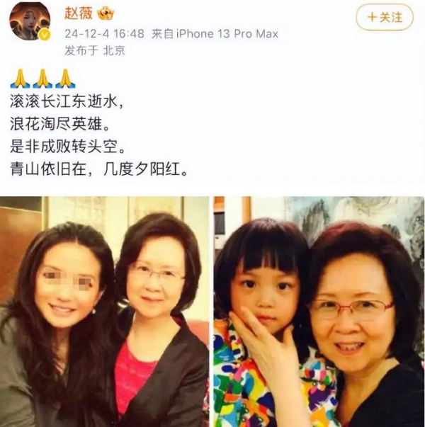 她退出荧幕后,很少发文,直到琼瑶的离开,她才发文悼念。