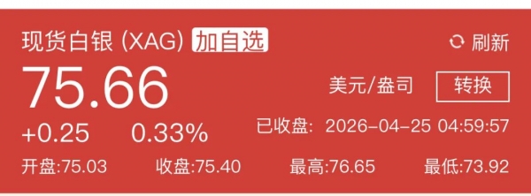 截至2026年4月25日5时,现货白银为75.66美元/盎司。