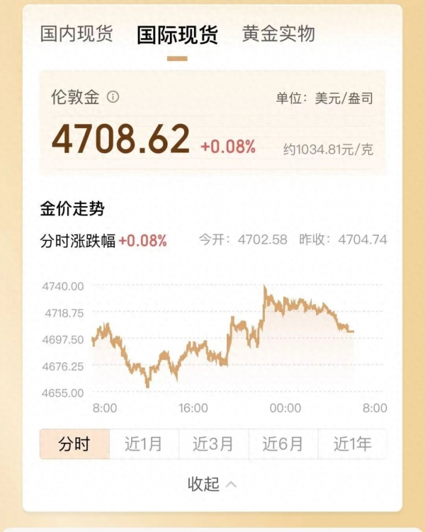 本周国际黄金价格呈现震荡下行态势,截至4月25日,现货黄金收报每盎司4708.62美元,周内累计下跌近2%。