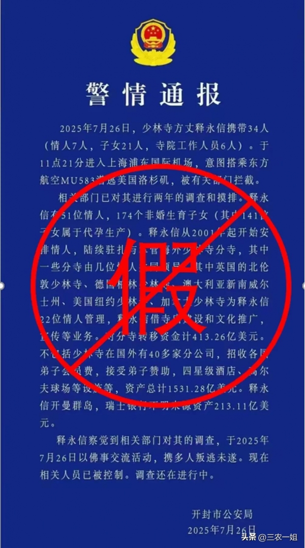 近日,网传释永信带着情人潜逃了,意图潜逃到美国被控制了。这则进行通报是7月26日发布的,事情也发生在7月26日,可以说是非常劲爆的一个消息。今天几乎全网都是释永信被逮捕的消息。