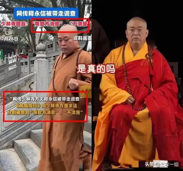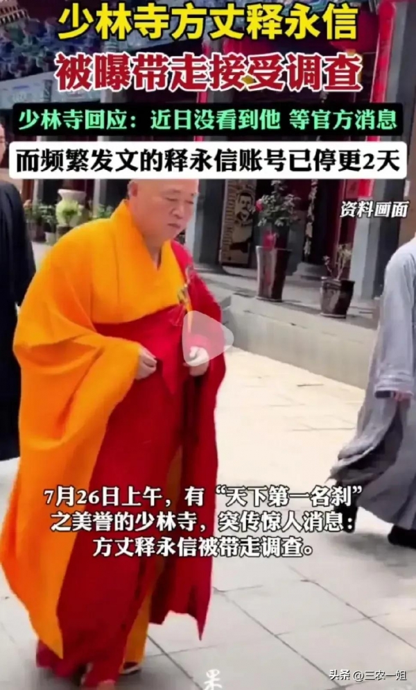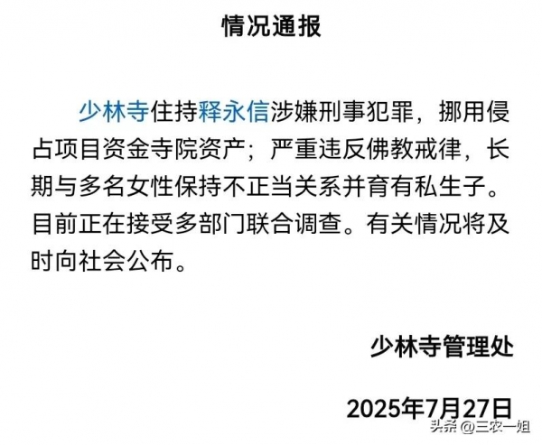 最新消息:7月27日,少林寺管理处发布了情况通报,少林寺主持释永信涉嫌刑事犯罪,挪用侵占项目资金寺院资产,严重违反佛教戒规,长期与多名女性保持不正当关系并生育私生子,目前正在接受多部门联合调查!