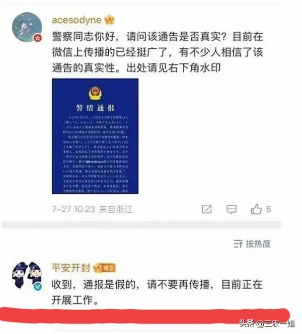 有网友针对这个信息,在网上呼叫了当地的警方,当地警方也给予了及时的回应。回应这个通报是假的,请不要再传播!关键是警方给出了最后一句话,令人捉摸:目前正在开展工作!