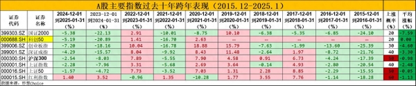 从历史规律来看,市场对跨年行情的乐观预期同样缺乏数据支撑。需要明确的是,我们所讨论的"跨元旦周期"(12月1日至次年1月31日),与一季度的"春季躁动"并非同一概念,前者近十年的市场表现更像是"行情淡季"。从A股主要指数表现来看,国证2000、创业板指、深证成指等核心指数近十年平均涨幅全部为负,其中创业板指平均跌幅达4.60%,国证2000更是高达7.59%;即便是表现相对突出的红利指数,上涨概率虽达60%,但平均涨幅仅为-1.13%,难以覆盖下跌周期的亏损。风格与行业维度的表现同样印证了这一规律:申万小盘风格平均跌幅7.03%,上涨概率仅20%,成长、周期类指数平均跌幅超4%;申万一级行业中,仅银行、家用电器等少数行业上涨概率超60%,且银行平均涨幅仅2.54%,多数行业平均跌幅超5%,并未出现普适性的趋势性跨年机会。