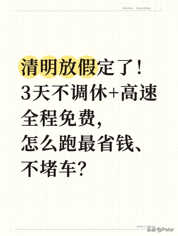 很多人一看到高速免费就开心,但真到上路的时候,要么搞错时间多花了钱,要么堵在高速上半天动不了,还有的因为ETC瞎操作耽误事。今天我就用最实在的话,把放假安排、高速免费怎么算、怎么开车不堵车、出门要准备啥、回老家扫墓要注意啥,全都讲明白,保证你看完就能用,不踩坑、不花冤枉钱。