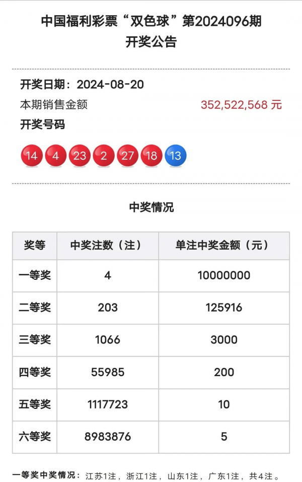 本期这4注一等奖,每注奖金1000万元,分别花落:江、浙、鲁、粤,四大热门地区,真的是运气爆棚!