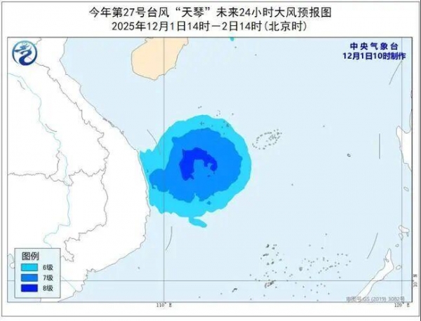 中央气象台12月1日10时继续发布台风蓝色预警:12月1日14时至2日14时,受今年第27号台风"天琴"(热带风暴级)影响,南海中西部和西南部海域、西沙群岛附近海域将有6~8级大风、阵风9~10级。