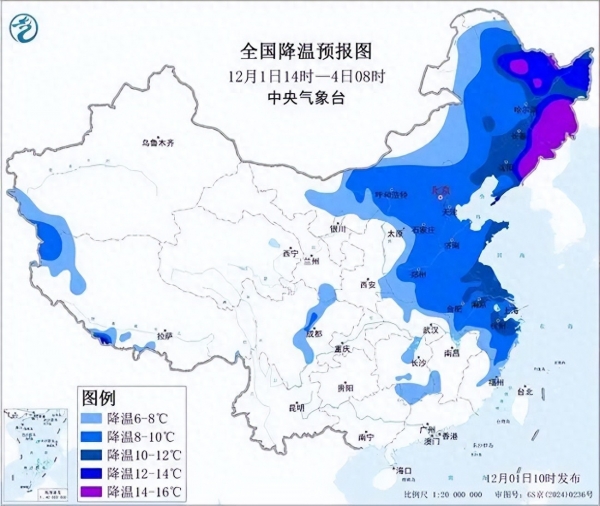 其中12月1日14时至3日14时,内蒙古东部、黑龙江中东部、吉林东部、辽宁东部、黄淮东部等地部分地区降温10~12℃,局地可达14~16℃。