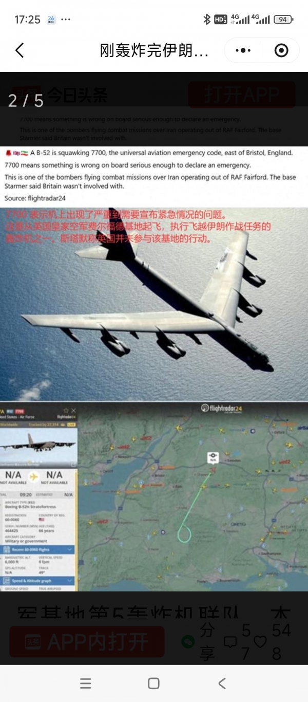 谁能想到,美军一直吹上天的B-52战略轰炸机,刚执行完针对伊朗的空袭任务,就在英国上空差点栽了大跟头。3月24日,英国布里斯托以东的空域,一架美军B-52H突然发出最紧急的7700航空代码,飞机立刻急速下降,慌慌张张掉头返航,最终勉强降落在英国皇家空军费尔福德基地,虽说没人受伤,但这架战机距离空中解体,就差一步。