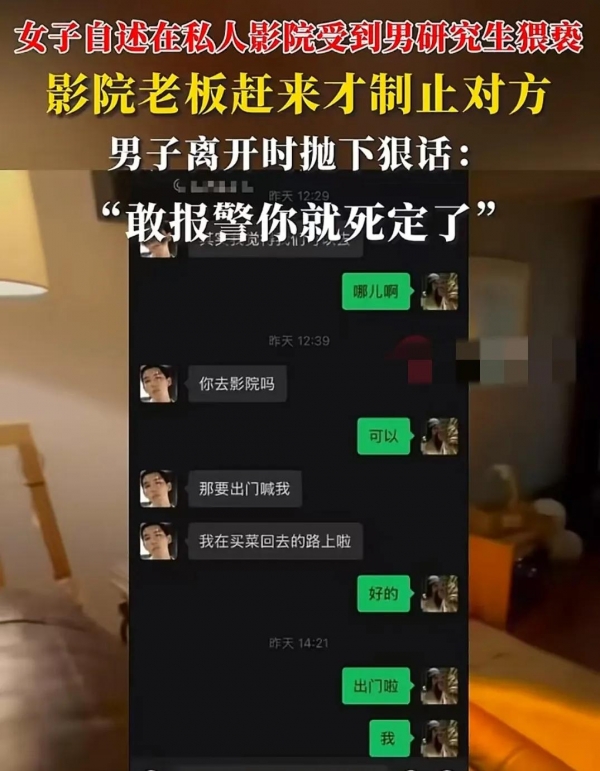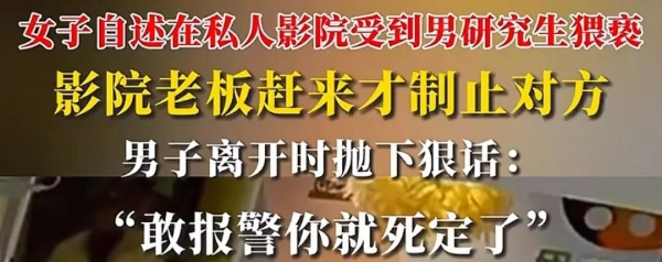 可以这么说,这名男研究生邀请她去私人影院是带着想法去的,而她本人却没有搞懂这个意思,所以只能怪她自己,随意的跟男网友出门儿。