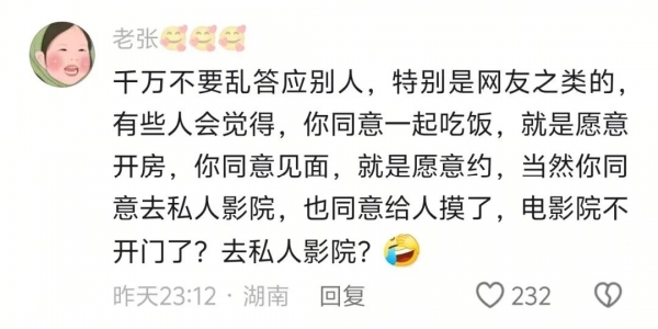 也有的网友说,千万不要乱答应别人,特别是网友之类的,有些人会觉得,你同意一起吃饭,就是愿意开房,你同意见面,就是愿意约,当然你同意去私人影院,也同意给人摸了,电影院不开门了?去私人影院?