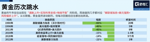 此外,从格隆汇总结的黄金历次跳水情况来看,黄金的牛市往往出现在"通胀上升+实际利率走低+地缘不稳"的阶段,而崩盘则几乎都对应"美联储加息+美元强势+风险偏好上升"。
