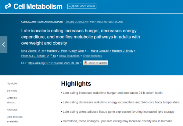 哈佛医学院的研究人员在《细胞代谢》上发表过一项研究,研究指出吃饭过晚会导致身体肥胖,且会增加食欲、降低能量消耗、改善脂肪组织基因表达。