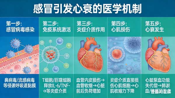 中国医学科学院阜外医院心血管内科主任医师樊朝美解释,感冒引发心衰主要有三大路径:一是柯萨奇B组病毒等病原体直接侵袭心肌,导致病毒性心肌炎,进而引发心肌坏死;二是感冒时人体代谢加快、心率升高,给本就有潜在心脏问题的患者增加负荷;三是感染引发的全身炎症反应,进一步损伤心肌功能 。