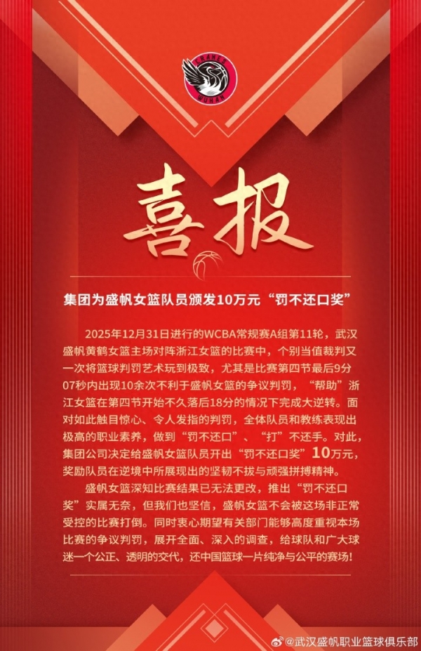 直播吧01月04日讯 WCBA武汉女篮在2025年12月31日80-81不敌浙江女篮的比赛结束后第二天,发文表示将为队员颁发10万元"罚不还口奖"。