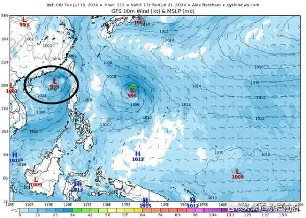 不过,一些预报认为,这个低压系统进入南海后全程强度偏弱,甚至都不一定能成为3号台风,但它在南海上吸收了一些季风水汽,因此仍有可能给华南地区带来一定程度的降雨,因此后期华南沿海预报出了连续的暴雨大暴雨。