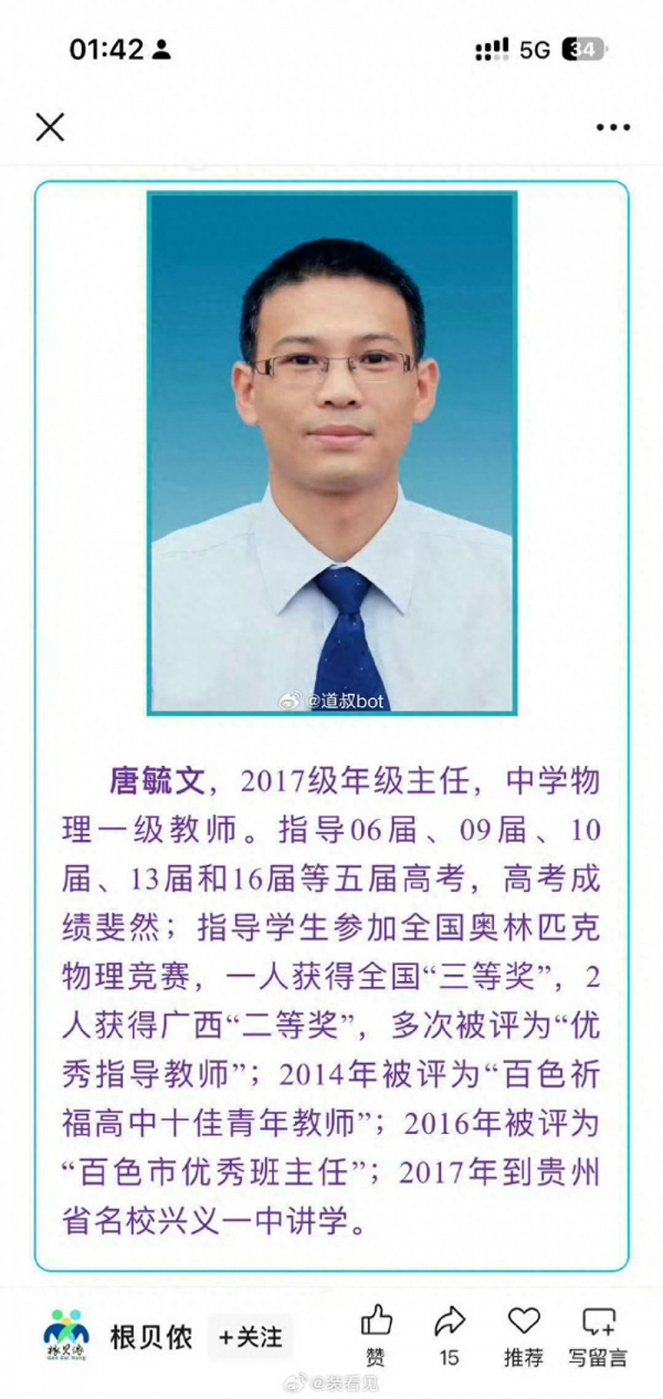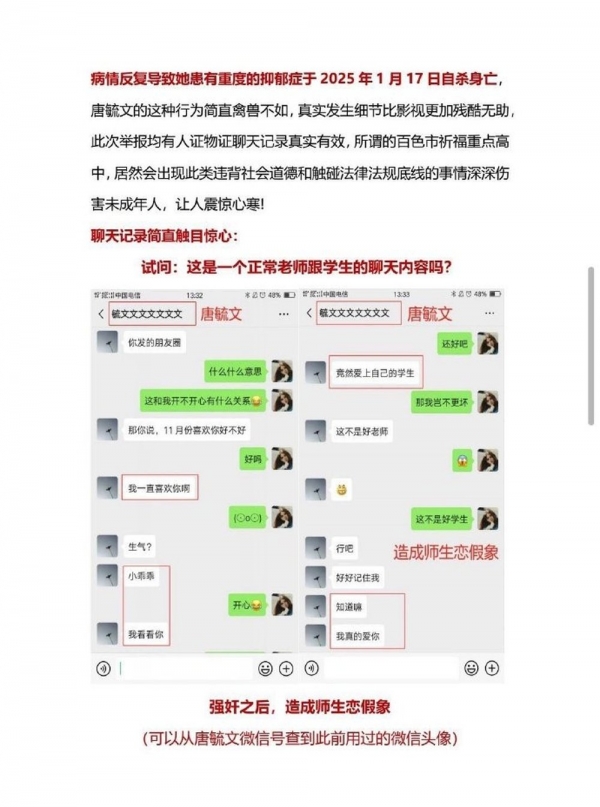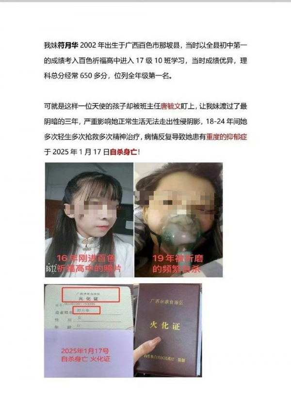 2月10日,有网友在社交平台公开举报称,广西百色祈福高级中学教师唐某某涉嫌性侵学生符某某,后符某某自杀身亡。