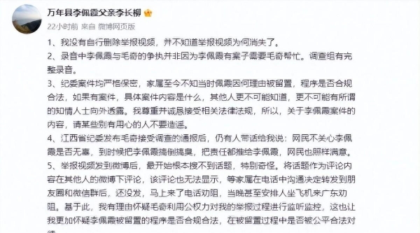 然而,纪委给出的说法是李佩霞涉嫌重大违法违纪,正在被留置调查。5月23日与毛奇争吵扬言举报,26日就被带走,时间点巧合引人遐想。