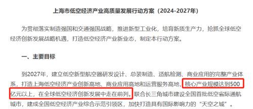 《行动方案》提出,到2027年,上海低空经济核心产业规模将达500亿元以上,并要打造具有全球影响力的"天空之城"。