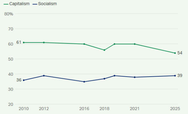 采访期间,CNBC记者提到了美国民调机构盖洛普去年9月公布的一项民调结果。结果显示,去年,美国人对于社会主义的正面看法高达39%;与此同时,美国人对资本主义持好感的比例近年来持续下降,已从2021年的60%下降至去年的54%。