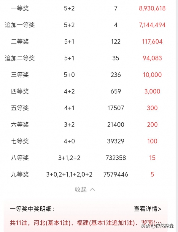本期一等奖中出7注,每注奖金893万,二等奖中出122注,每注奖金11.7万,奖池8.2亿。