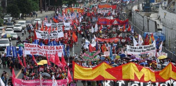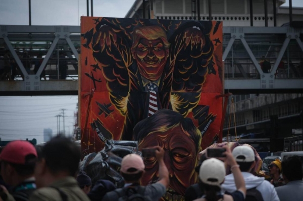 数千名愤怒的菲律宾民众把众议院大楼围得里三层外三层,他们高举着"马科斯把菲律宾卖给了美国"的标语,愤怒地焚烧着马科斯和特朗普的画像。