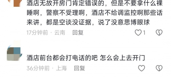 当然也有比较理性的网友,认为酒店无故开房门肯定错误的,但是不要拿什么裸睡啊,警察不受理啊,酒店不给调监控啊那些话来讲,都是空谈没证据,说了没意思博眼球。