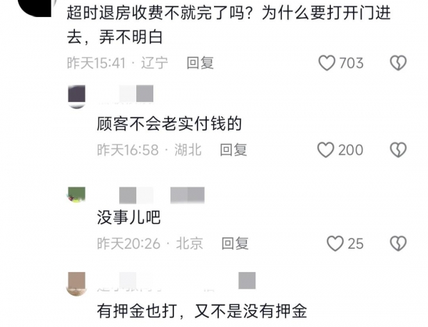 视频一经发出,引来了很多网友讨论,有网友表示超时退房收费不就完了吗?为什么要打开门进去,弄不明白。