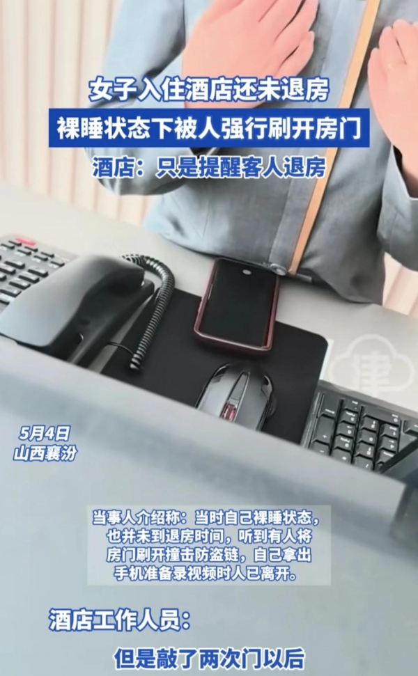 之后女子就去找酒店讨要说法,结果酒店的回应却让人难以接受,酒店方表示,中午11:20左右,是酒店服务员敲门女子房间的门无人应答,以为女子已经退房离开了,于是便刷卡开门,只是看到防盗链后就赶紧离开了。